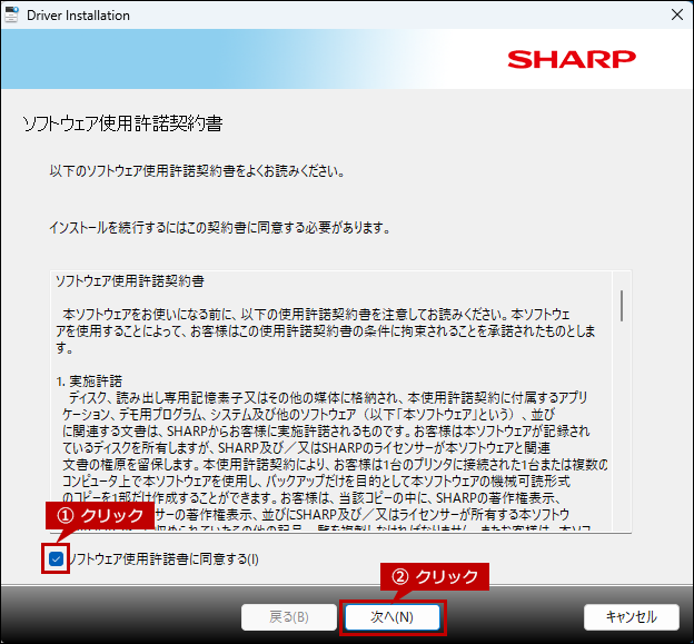 [ソフトウェア使用許諾書に同意する(I)]をチェックして、[次へ]をクリックします。