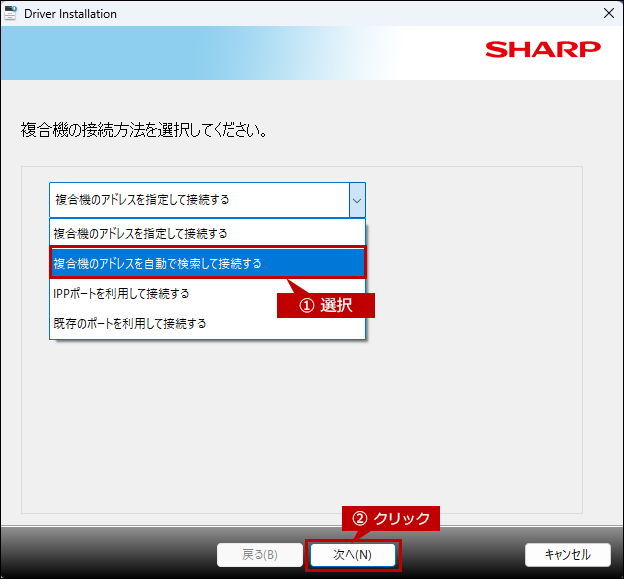 [複合機のアドレスを自動で検索して接続する]を選択して、[次へ]をクリックします。