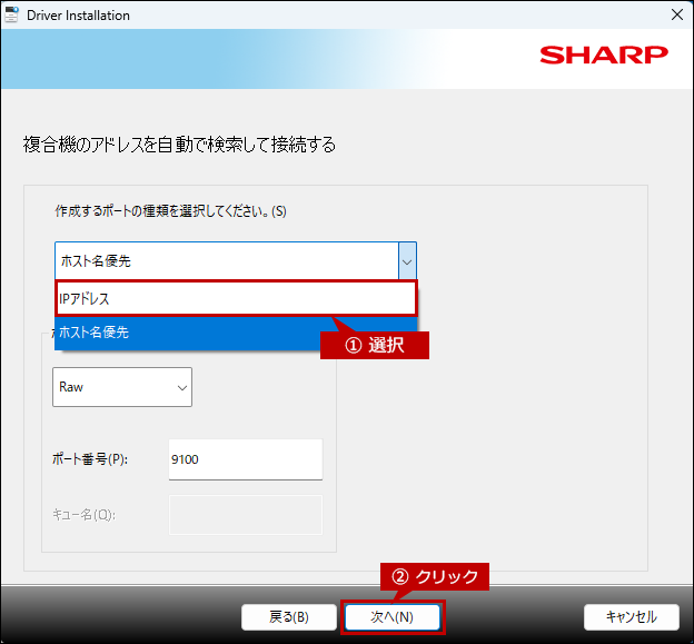 詳しい操作方法は「プリンタードライバーのインストールで、複合機が検索されない。【Windows版】」をご覧ください。