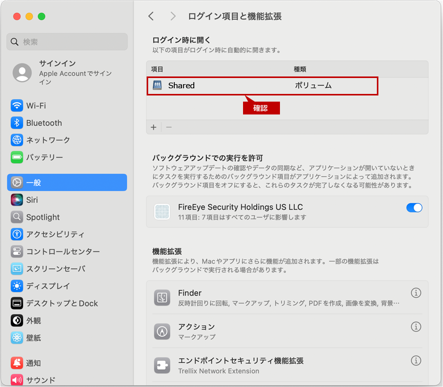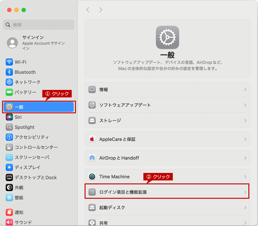3. 「システム設定」画面が表示されますので、「一般」の[ログイン項目と機能拡張]をクリックします。