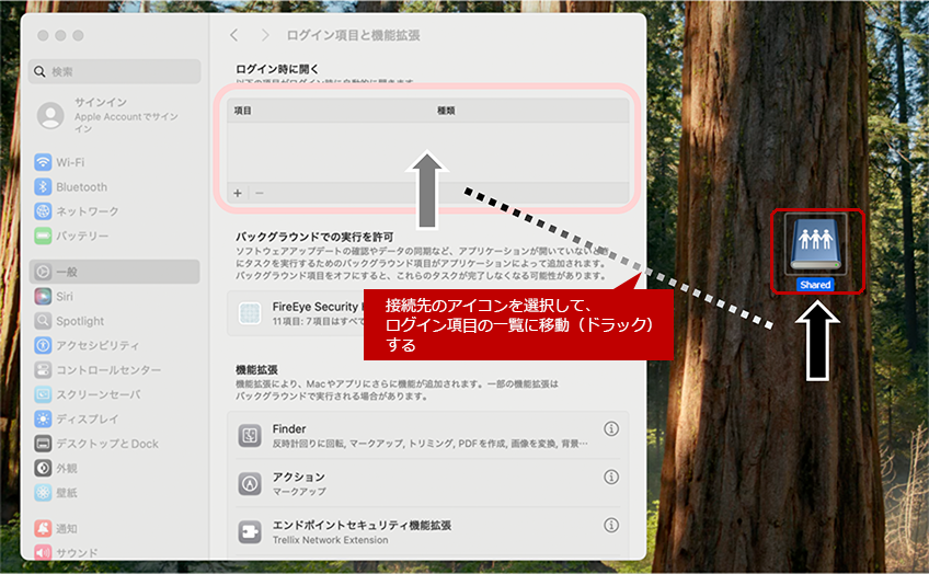 4. デスクトップに表示されている接続先のアイコンを「ログイン項目」の一覧へ移動(ドラッグ)します。