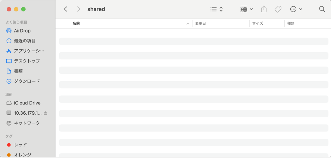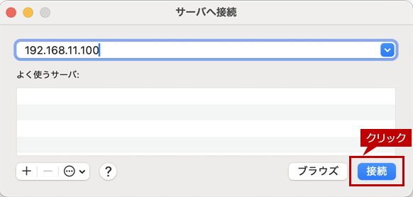 Macのメニューバーの[移動]リストにある「サーバーへ接続」で複合機のアドレス(例:192.168.11.100)を入力して接続します。