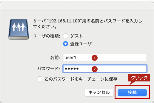 4. 認証画面が表示されますので、①名前(例:user1)と②パスワードを入力して[接続]をクリックします。