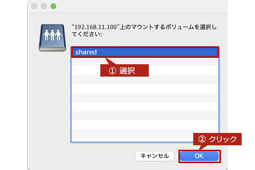 5. 複合機の共有フォルダーが表示されますので「共有フォルダー(例:shared)」を選択し、[OK]をクリックします。
