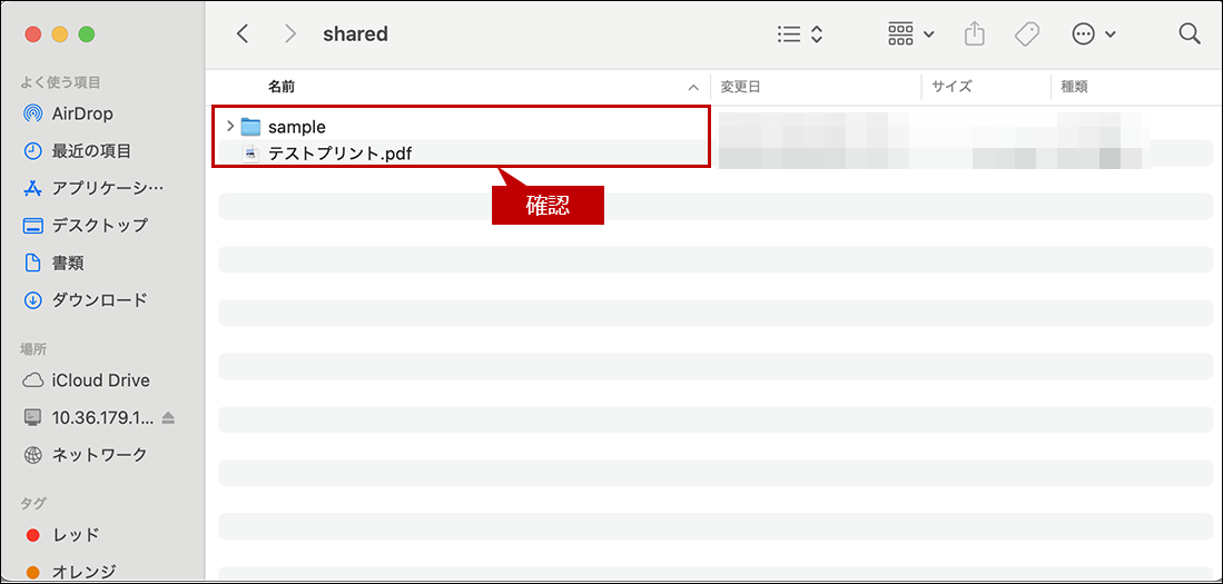 6. フォルダー(例:sample)または、ファイル(例:テスプリント.pdf)を作成し、複合機の共有フォルダーを利用できることを確認します。