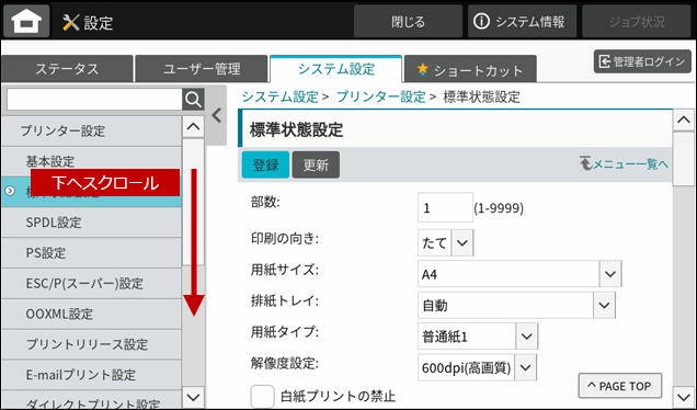 3.「プリンター設定」画面が表示されますので、ページを下へスクロールします。