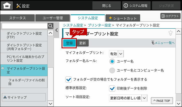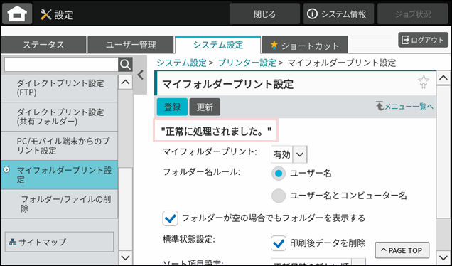 「マイフォルダープリント設定」の「フォルダーが空の場合でもフォルダーを表示する」を有効にすることで、フォルダーが空でもフォルダーを表示することができます。