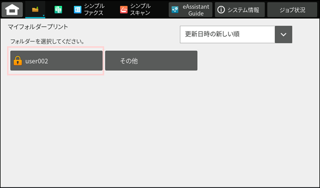 8. 「マイフォルダープリント」画面に戻りますので、パスワードを設定したフォルダーのボタンに鍵マークがついていることを確認します。