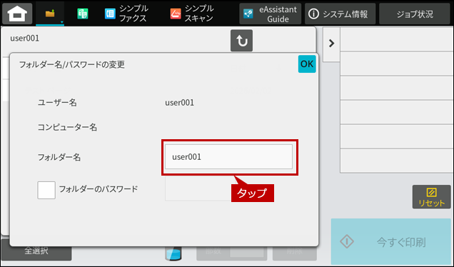 6.「フォルダー名/パスワードの変更」画面にもどりますので、フォルダー名が変更されていることを確認して、[OK]をタップします。