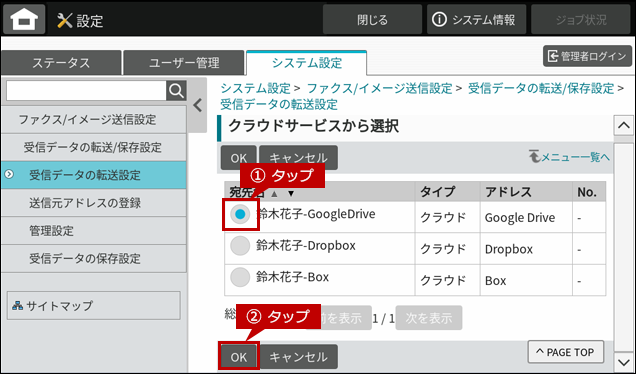 これで、ファクスの受信データの転送設定が完了しました。以降、ファクスの受信データは指定したクラウドストレージに転送されます。