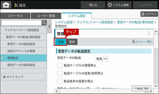 16.「管理設定」画面が表示されますので、[受信データの転送]をタップします。