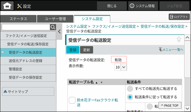 「受信データの転送設定」画面で、受信データの転送設定が「有効」になっていることを確認します。