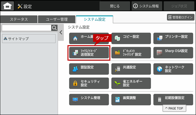 2.「システム設定」画面が表示されますので、[ファクス/イメージ送信設定]をタップします。