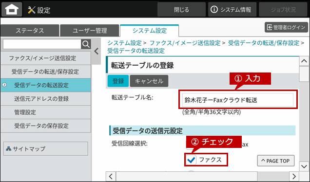 転送テーブル名の例)鈴木花子-Faxクラウド転送