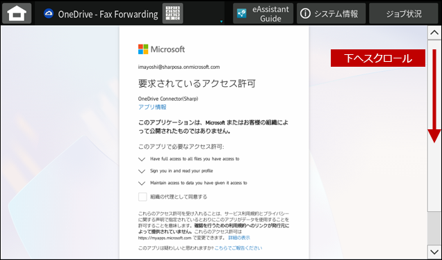 ①「要求されているアクセス許可」の画面が表示されますので、画面を下へスクロールします。