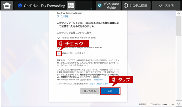 ②[組織の代理として同意する]にチェックして、[承諾]をタップします。