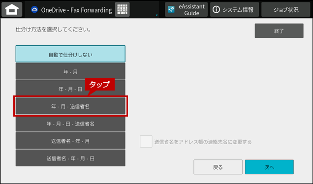 16.「仕分け方法を選択してください。」の画面が表示されますので、[仕分け方法]を選択します。
