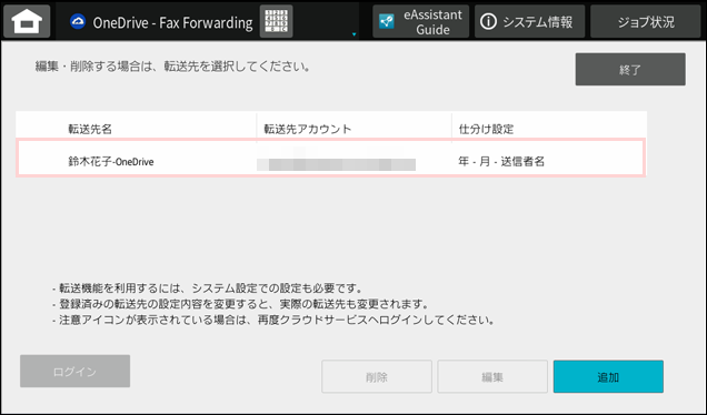 19.「編集・削除する場合は、転送先を選択してください。」の画面が表示されますので、転送先名が追加されたことを確認します。