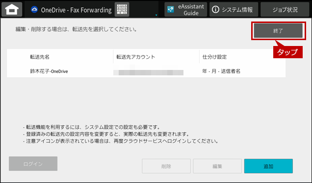 - 次に、「OneDrive - Fax Forwarding」でファクスの転送先を設定します。
