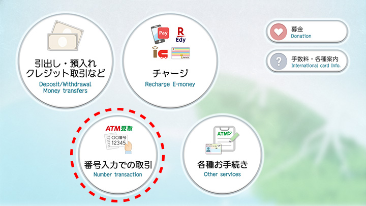 セブン銀行ATM初期画面の“番号入力での取引”を押し、指示に従って番号を入力し、取引内容を確認します。