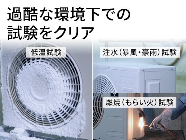 暴風豪雨に対しても、公的規格より厳しい基準で台風と注水試験を行い、室外機の運転を確認しています。