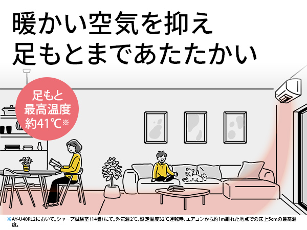 まくれやすい暖かい空気を大きなルーバーで抑えることで、足元付近まで温風を届け、足元まで暖かい。