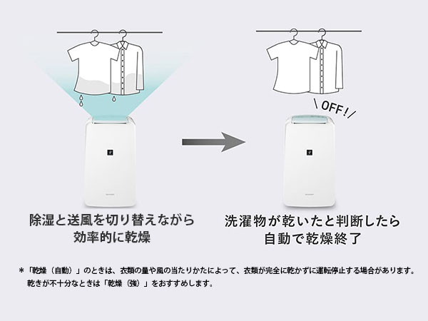 お部屋の湿度変化から衣類の乾き具合を予測。乾いたと判断したタイミングで自動で乾燥運転を終了します。