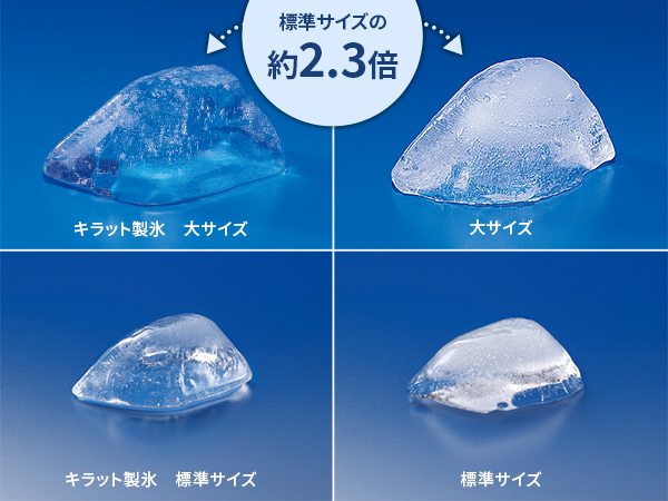 大きく透明な氷で、溶けにくく飲み物が薄まりにくいです。容器に合わせて氷のサイズを選べます。