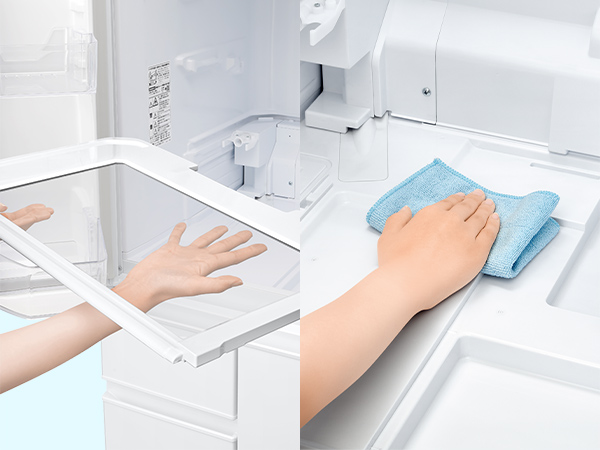 チルド上の棚まで全て取りはずしができるので、今まで掃除ができなかったところまで簡単にお掃除可能に。
