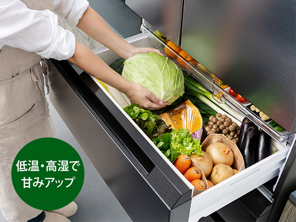 かがまずに楽に使える真ん中レイアウト。低温・高湿環境で、野菜の甘みを引き出し新鮮に保存します。