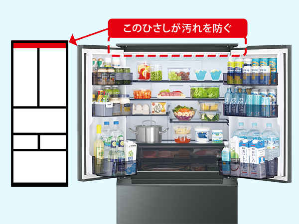 冷蔵室上部のひさしが、キッチンの気になるホコリや油煙を防いで、パッキンを汚れからガードします。
