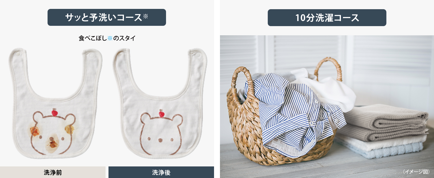 <サッと予洗いコース>洗剤なしで汚れを素早く落として予洗いします。予洗い後は、他の洗濯物を入れて一緒に洗えます。(洗濯容量0.5kg以下)