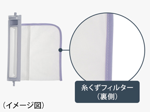 水流にのった糸くずを、袋状のフィルターでしっかりキャッチ。フィルター裏側の布端にあて布をかぶせることで、糸くずを取り除きやすくしています。また洗濯槽に穴がないので、糸くずが槽の外側に逃げることもありません。