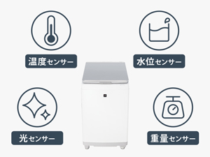 ECO eyes(光)・重量・水位・温度の4つのセンサーを搭載。衣類の量や布質を見分けて最適な洗濯時間を調整します。
