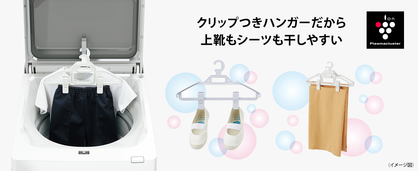 ハンガーにかけて乾かすことができるシャープだけの「ハンガー除菌※1・乾燥※2コース」を搭載。乾燥運転中にプラズマクラスターを放出して、衣類を除菌※1します。シワを抑えてスピーディに乾燥するので、お急ぎのときに便利です。また、小物や干場に困るシーツなどの大物の乾燥にも便利です。