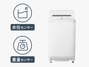 重量と水位の2つのセンサーを搭載。衣類の量や布質を見分けて最適な洗濯時間を調整します。