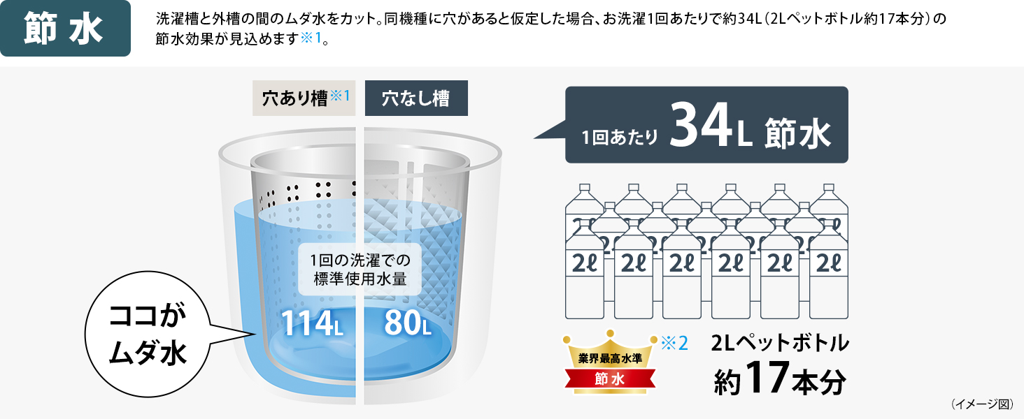 洗濯槽と外槽の間のムダ水をカット。同機種に穴があると仮定した場合、お洗濯1回あたりで約34L(2Lペットボトル約17本分)の節水効果が見込めます※1。
