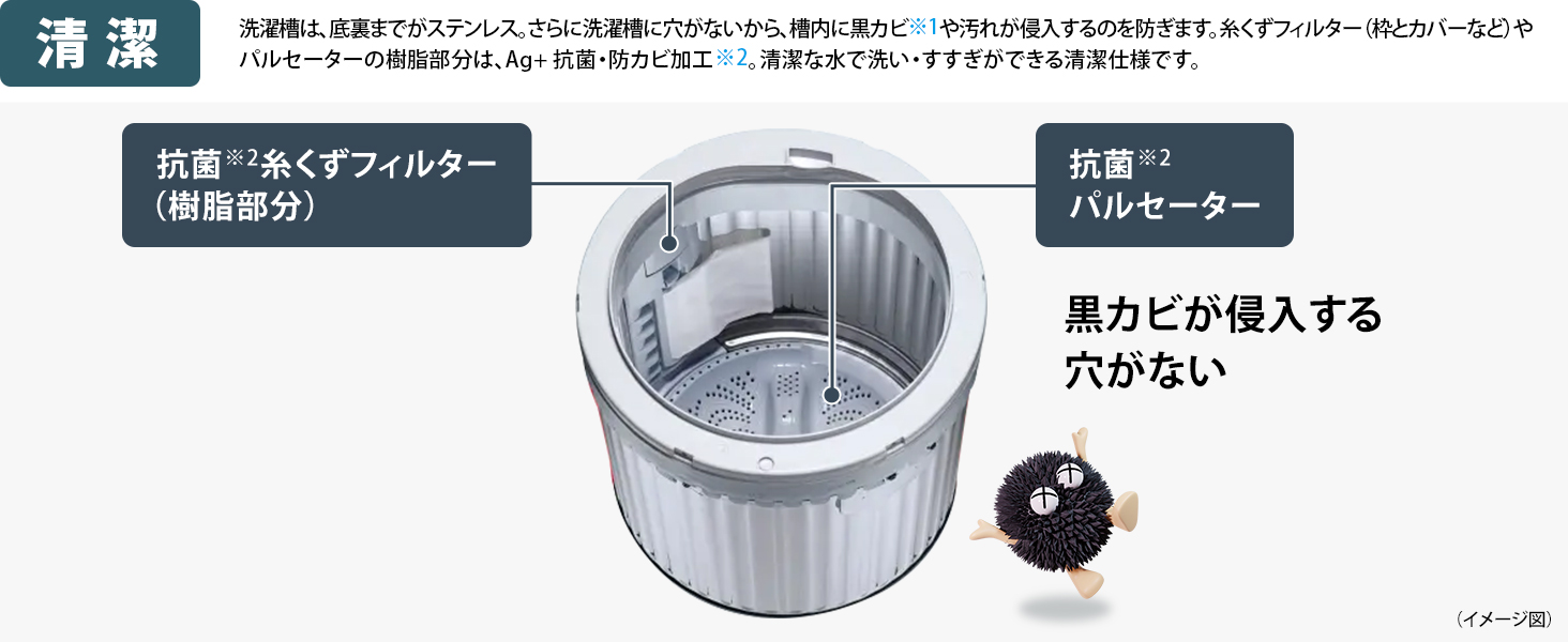 ※1 衣類を汚す原因となる黒カビ等が侵入しにくい構造となっています。ご使用方法・ご使用洗剤によっては、パルセーターの裏に洗剤カス等を原因としたカビ状の汚れがつき、混入する場合があります。