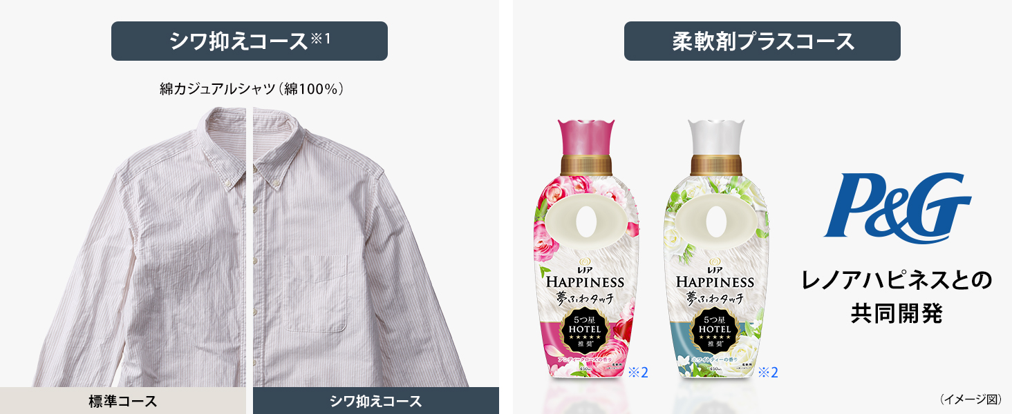 <柔軟剤プラスコース>最終すすぎ時に衣類を水でほぐしてから柔軟剤を投入。柔軟剤を衣類全体に均一にコーティングし、柔軟剤の効果を高めます※2。(洗濯容量2kg以下※3)また、柔軟剤の有効成分をより多く衣類に残し、柔軟剤の効果を高めるように衣類をすすぎます※2。