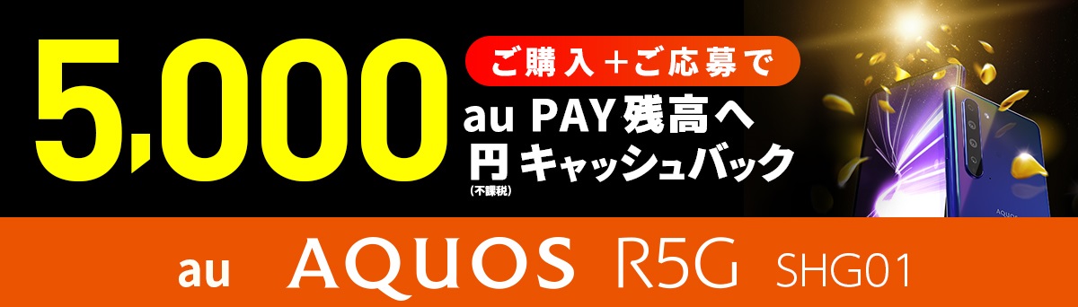 期間中にau AQUOS R5G SHG01をご購入し、キャンペーンにご応募いただくと、au PAY残高へ5,000円キャッシュバック!
