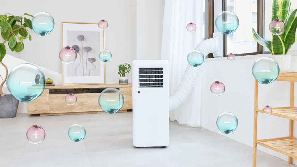 - *当技術マークの数字は、商品を壁際に置いて、風量強運転時にプラズマクラスター適用床面積の部屋中央(床上1.2m)で測定した1cm³当たりのイオン個数の目安です。
