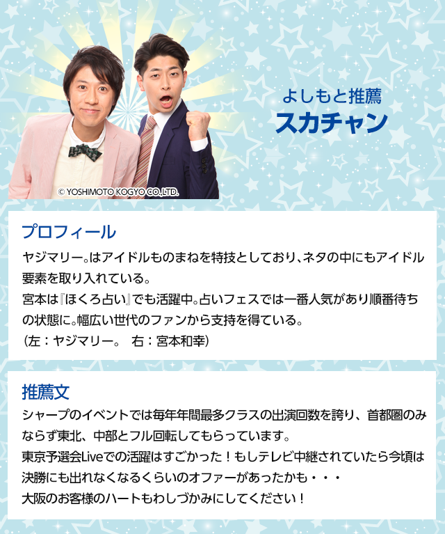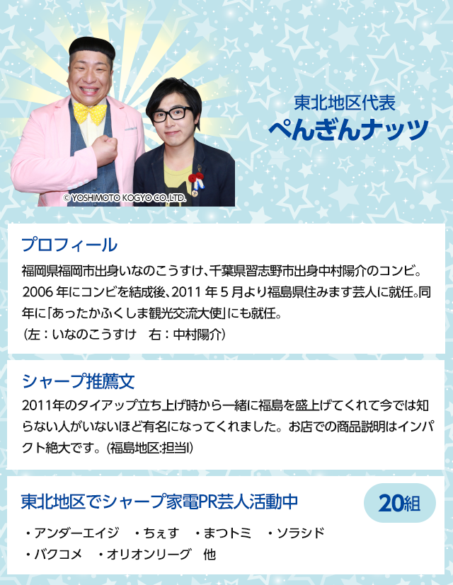全国のイベントや店頭で活躍する多くのシャープ製品PR芸人から10組を選抜。