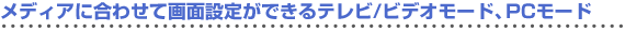 テレビやDVDなどを見るときは映像が美しい高輝度で、パソコンを使うときは明るさを控えめになど、テレビ/ビデオモードとPCモードで独立して明るさ・色味などの画面設定が可能です。