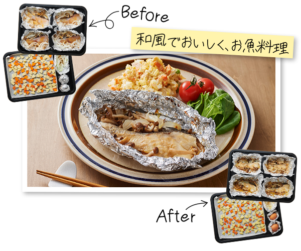 - 3.1つ目の角皿:アルミホイルにたら、玉ねぎ、しめじを並べて、あわせ調味料をかけて閉じる。