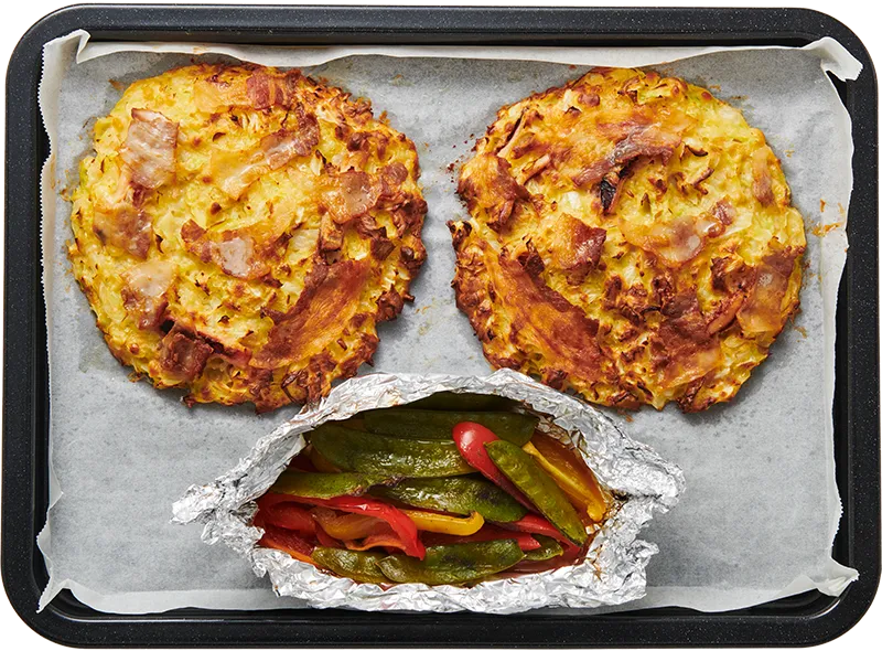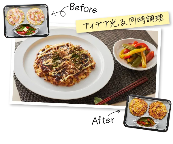 ひっくり返さなくてもキチンと両面焼ける!外はカリッ、中はふわふわ~。お好み焼きだけでなく副菜まで同時調理できるのもいいですね。