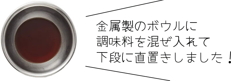 - 3.甘酢タレの材料は、金属製のボウルに入れて直接庫内に置く。 ※使える容器については、取扱説明書をよくご確認ください。