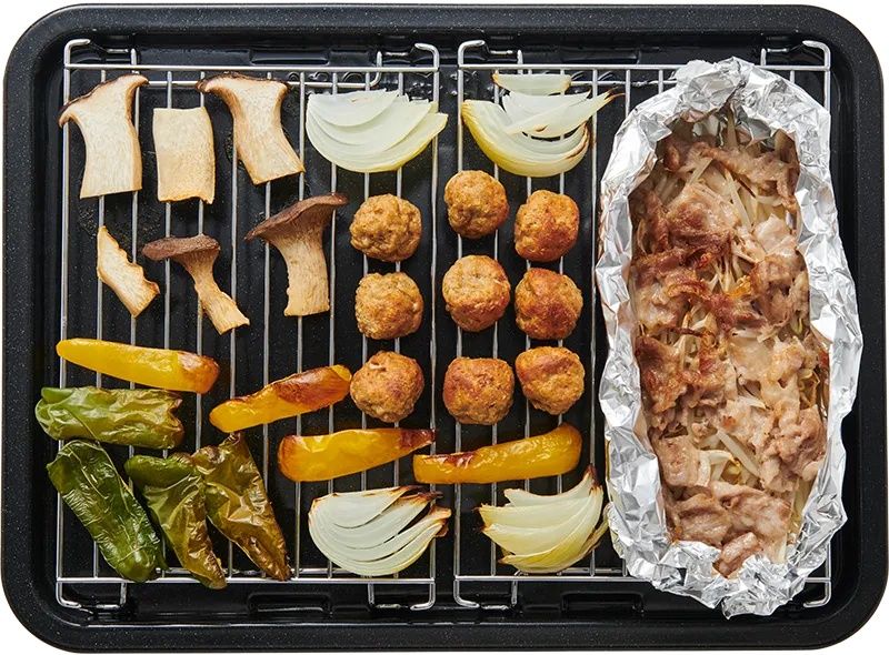 お肉の調理は上段で!肉だんごは上段網の真ん中に並べて、豚肉もやしもアルミホイルで包んで上段にセット。再現レシピ動画では、金属製のボウルに入れた合わせ調味料を直置きにして調理してみました。