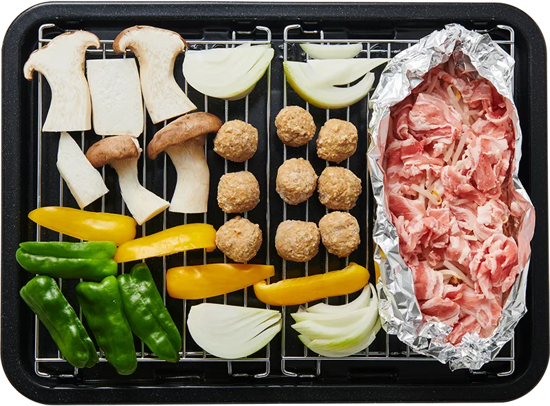 - 2.角皿にアミをのせ、アミの中央寄りに冷凍鶏だんご、そのまわりに野菜とアルミホイルに包んだ豚肉ともやしを並べて上段にセット。