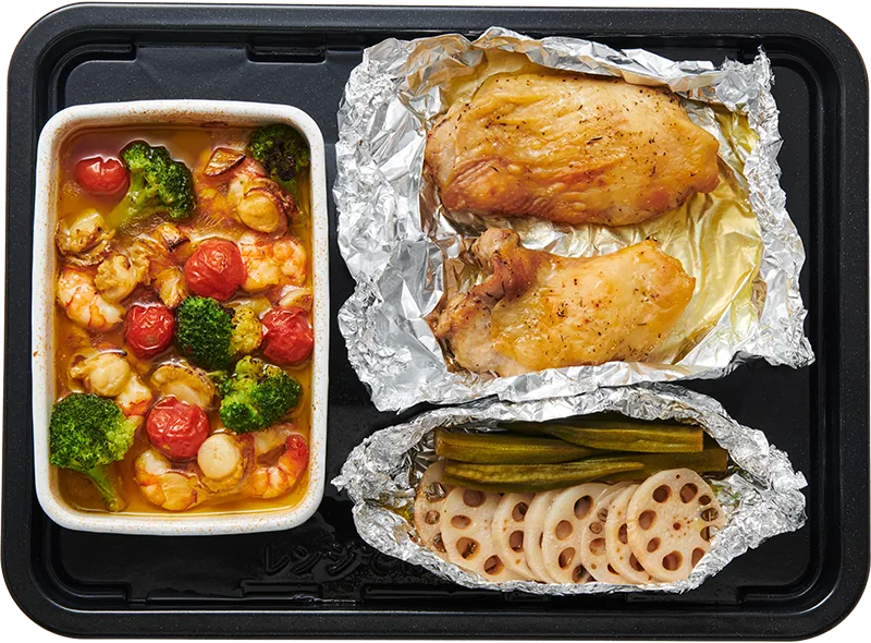 - 4.耐熱容器にブロッコリー、ミニトマト、ボイルのほたて、えび、にんにくを入れて、塩とオリーブオイルをかける。※使える容器については、取扱説明書をよくご確認ください。