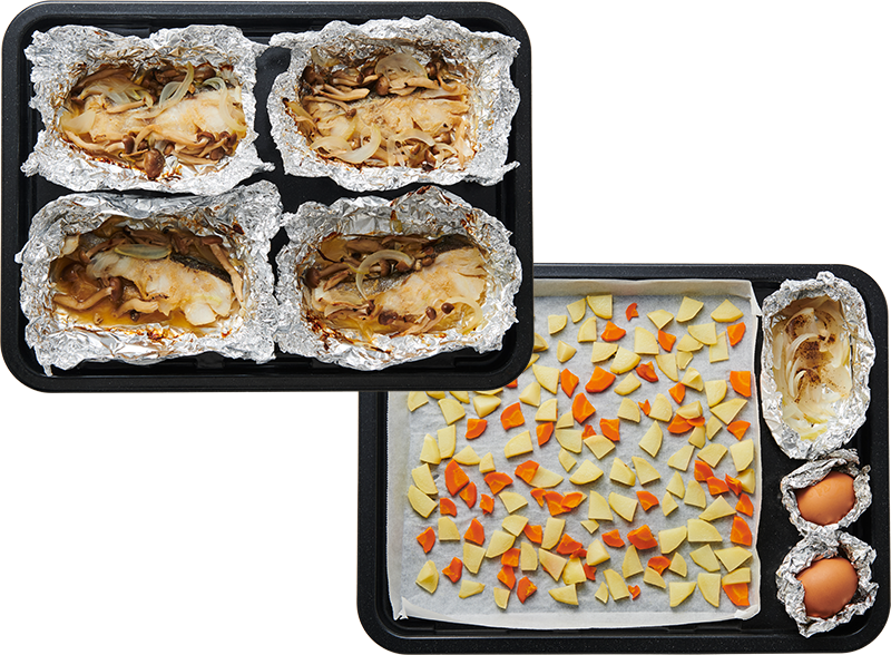 - 4.2つ目の角皿:クッキングシートを敷き、じゃがいも・にんじんを並べて、玉ねぎと卵はアルミホイルに包んで並べる。※玉ねぎはアルミホイルに包んで塩、こしょうをかけて閉じる。